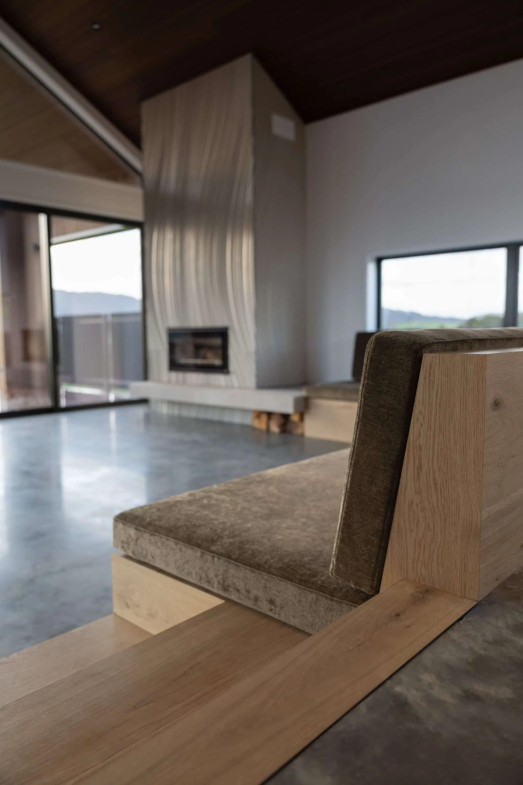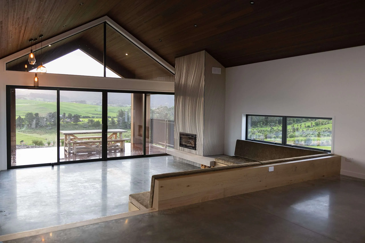 Cove Road is a contemporary architectural home in Mangawhai shaped by strong gable geometry, warm natural materials, and carefully framed rural outlooks. A soaring timber-lined ceiling and expansive glazing define the primary living spaces, drawing light deep into the interior while establishing a calm, grounded connection to the surrounding landscape. Stone surfaces, crafted joinery, and precisely detailed finishes create a restrained yet highly tactile interior, balanced by sheltered outdoor living designed for year-round use. Every element reflects disciplined coordination between architectural intent and construction delivery. Thoughtfully composed and precisely executed, Cove Road embodies Green Build Projects’ approach to architectural construction across Mangawhai and Northland—delivering enduring homes defined by clarity, craftsmanship, and quiet confidence.