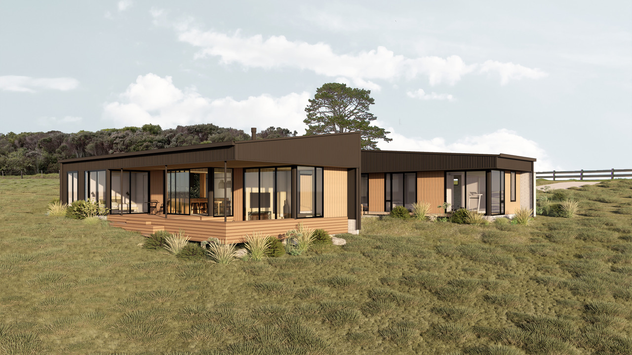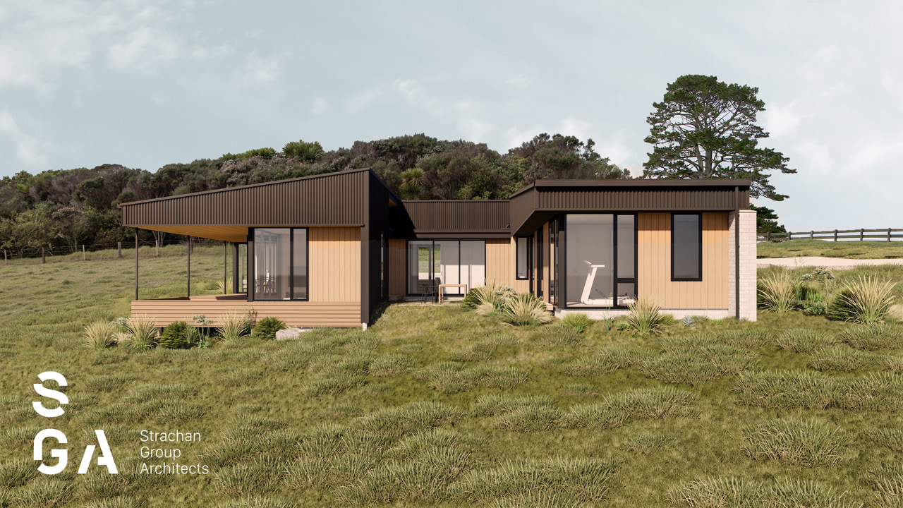 Designed by SGA for a spectacular Te Arai setting, this custom residence balances a bold exterior form with a warm and highly detailed interior palette. The home is clad in Metalcraft Kahu finished in Flaxpod Matt, complemented by cedar to selected walls and soffits for a softer natural contrast. Internally, polished concrete floors provide a grounded base, while cedar-lined walls and ceilings wrap the living areas, master suite and sunken lounge to create depth, warmth and a strong sense of retreat. Bespoke detailing is central to the project, from the custom-built seating integrated into the sunken lounge and outdoor deck, to the carefully resolved joinery, walnut finishes and fireplace feature that shape the home’s character. Built by Green Build Projects, this home is a strong example of a truly custom architectural build — restrained, tactile and highly considered at every level.