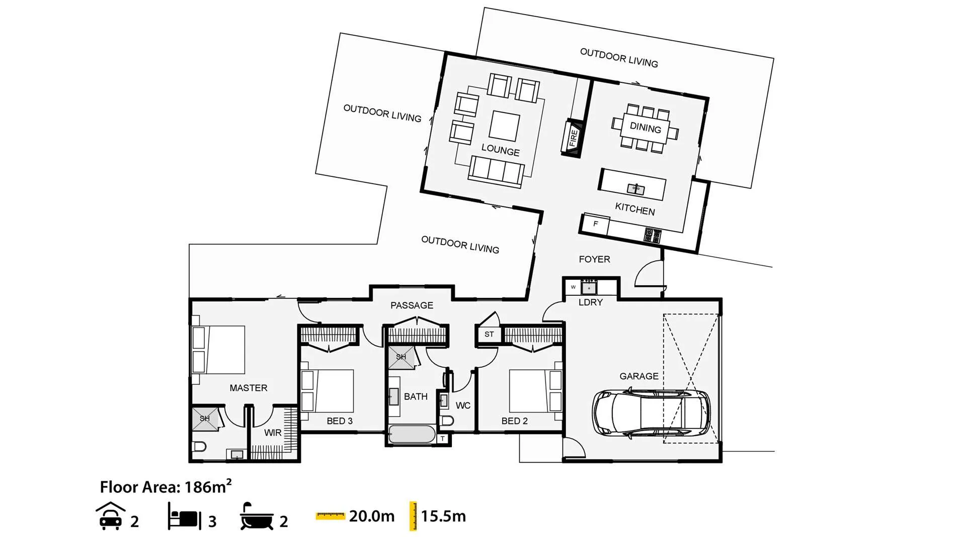 Two main wings provide the basic layout of this home. The bedroom wing is longer and provides the perfect shelter and privacy to the outdoor living and lawn space. By having the living wing set at an angle the kitchen and dining are positioned in the morning sun. The angle also gives a very sheltered outdoor living space between wings and a view angle from the lounge which reaches out into the property. This home could give your section the edge you're looking to create.