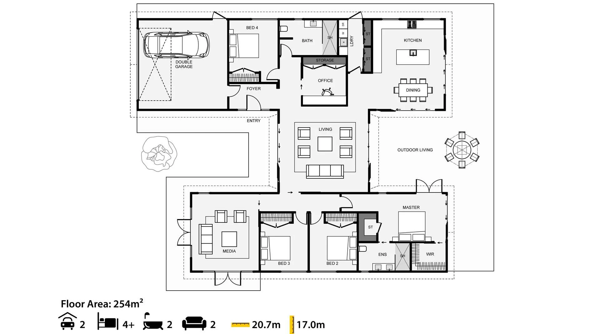 The Jada is one cool home. Thanks to the layout, little things like the one separate bedroom with direct bathroom access, (great for visitors), and an office close to the foyer, help to make this home easy to live in. Other nice aspects include the dual living, (both with external access), the separate kitchen and dining plus the north facing master bedroom will make the thought of building exciting!