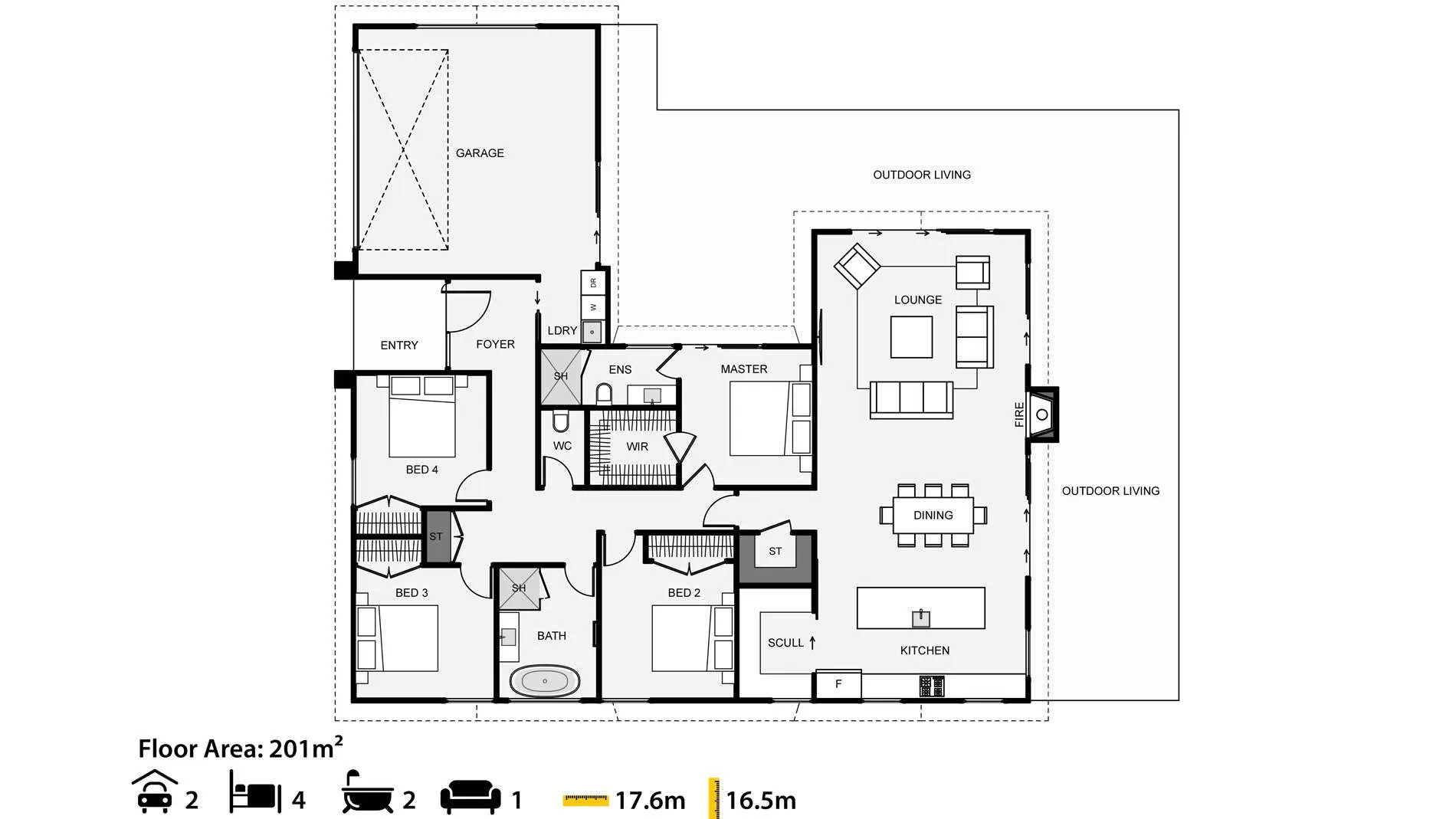 Designed to cover four bedrooms within a small footprint, this home comes with a lot of value. The garage smartly offsets the home to create a private outdoor space. The kitchen is a good size and includes a scullery. The main living wing has the option for a flat, scissor or sloped ceiling, which can make a big difference in interior feel. With this design, you can get a lot of family home within a smaller budget.